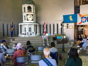 今回のイベントは、JR函館駅前にある函館ツインタワーの公開空地で行われました。この場所には、ハリファックスのランドマークの一つである「オールドタウンクロック」と呼ばれる時計塔の模型が設置されており、函館とハリファックスの姉妹都市関係を象徴する場所になっています。
